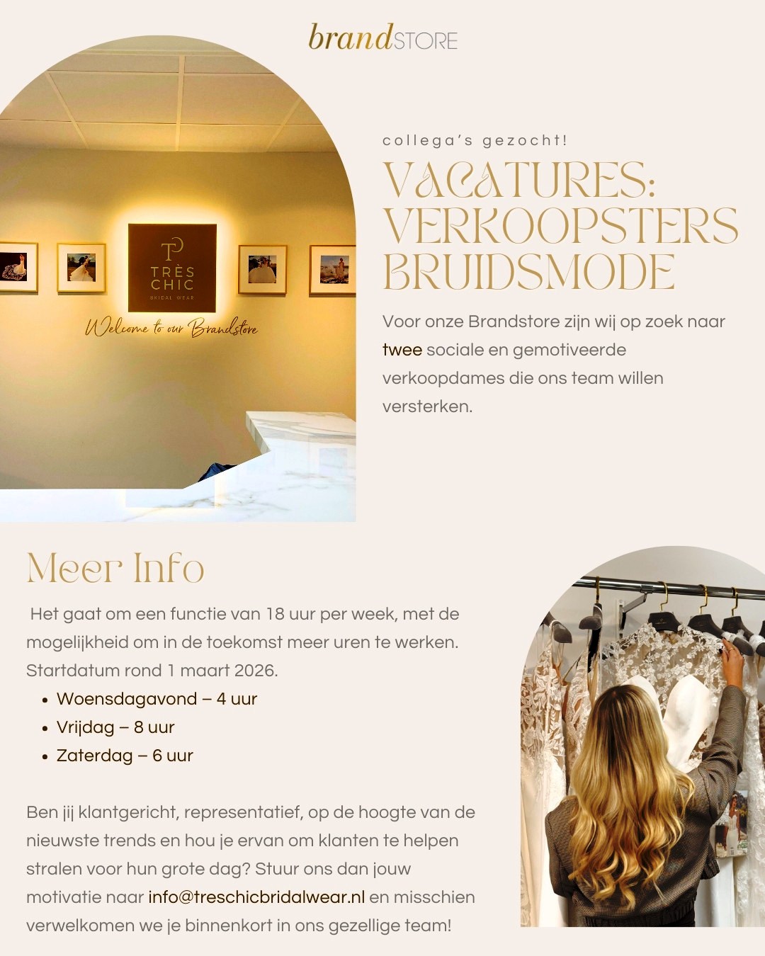 Ben jij klantgericht, representatief, op de hoogte van de nieuwste trends en hou je ervan om klanten te helpen stralen voor hun grote dag? Stuur ons dan jouw motivatie naar [email protected] en misschien verwelkomen we je binnenkort in ons gezellige team!