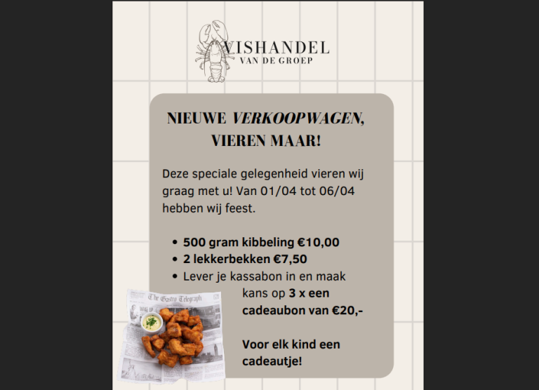 Deze speciale gelegenheid laat de vishandel niet zomaar voorbijgaan. Van 1 april t/m 6 april wordt de komst van de nieuwe wagen gevierd met een feestelijke week vol acties: