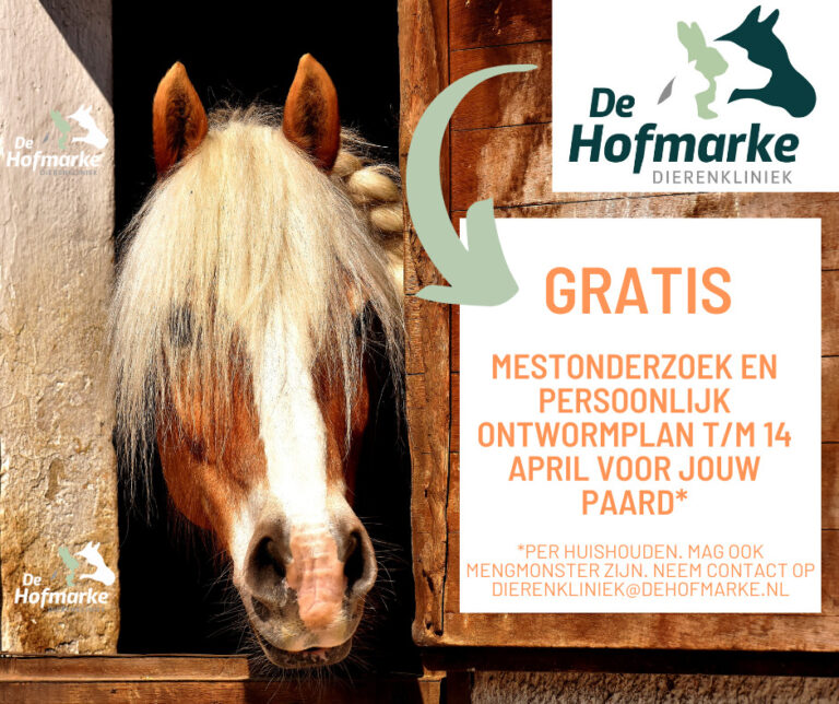 Wij van dierenkliniek de Hofmarke proberen zo min mogelijk ontwormingsmiddelen te gebruiken bij paarden. Dit is minder belastend voor je paard en het geeft zo min mogelijk opbouw van wormresistentie. Om je paard toch goed te beschermen of te behandelen maken wij gebruik van mestonderzoek. Nu de temperatuur stijgt (dat is een goed moment voor wormonderzoek) en wij een actie voor het gratis laten onderzoeken van mestmonsters hebben worden wij bedolven onder de mest. De poep komt nog net niet onze oren uit! Gelukkig stinkt paardenmest niet echt, in tegenstelling tot honden- en kattenpoep.