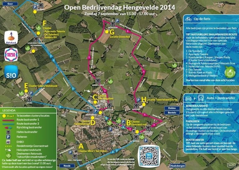Waarin een klein dorp als Hengevelde groot kan zijn. Van de 2.100 Hengeveldenaren zijn er ruim 100 actief als zelfstandig ondernemer met samen meer dan 1.000 werkplekken! De deelnemers halen alles uit de kast om van deze derde Open Bedrijvendag een grootse happening te maken. Er zijn verschillende rondleidingen door bedrijven en er is vermaak voor jong en oud! Tussen de bedrijfsbezoeken door kunnen de kinderen ravotten op de bungee-trampoline, de klimtoren plus grote glijbaan, zwieren in de draaimolen en staan er op diverse locaties springkussens opgesteld, etc. De onderstaande clusters en locaties komen overeen met de plattegrond in de folder.