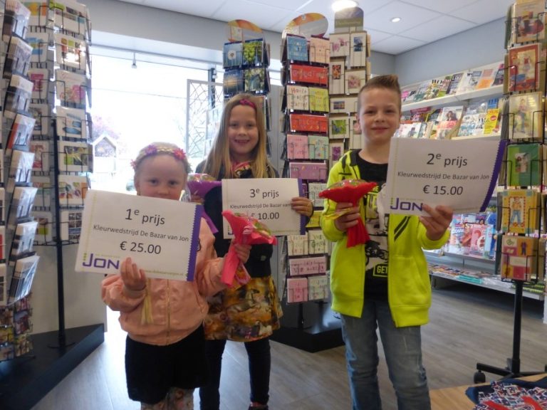 Deze week was de prijsuitreiking van de kleurplatenwedstrijd van de Bazar van Jon. Jon Klein Breteler:”Iedereen heeft enorm zijn best gedaan maar er sprongen toch drie kleurplaten uit. Dat waren die van Justin Ikink, Sylvie Rupert en Jessie Leusink. Ze hebben deze week hun prijs en wat lekkers in ontvangst genomen. De Bon van Jon hebben ze dan ook meteen uitgegeven. Het was een geslaagde kleurwedstrijd!