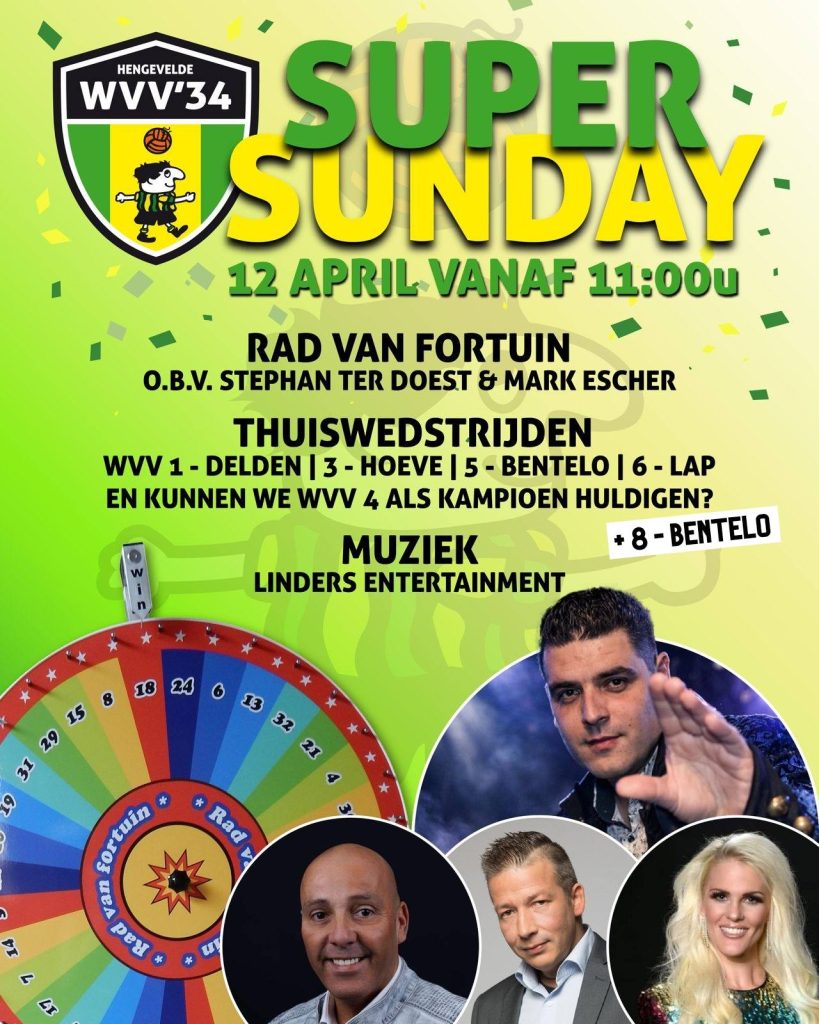 Zondag 12 april staat Sportpark Ruperts Erve volledig in het teken van Super Sunday. Vanaf 11:00 uur is er volop vertier met het Rad van Fortuin (gedraaid door O.B.V. Stephan ter Doest & Mark Escher), live muziek van Linders Entertainment en natuurlijk een hele rits thuiswedstrijden. En er is goed nieuws: ook het 8e elftal van WVV’34 speelt die dag thuis tegen Bentelo.De poster van de club maakt het al duidelijk: naast de wedstrijden van WVV 1 (tegen Delden), 3 (tegen Hoeve Vooruit), 5 (tegen Bentelo) en 6 (tegen La Premiére) staat er een extra witte sticker met “+ 8 – BENTELO”. Ook zij spelen thuis. Daardoor wordt het een échte voetbaldag voor de hele vereniging, van het eerste tot het achtste elftal.Vol programma op Super Sunday.
