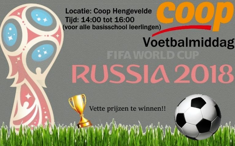 Carla Hemel namens Coop Hengevelde: ”Naar aanleiding van de spaaractie “wereldballen” organiseren we aanstaande zaterdag (30 juni red.) vanaf 14.00 tot 16.00 een voetbal (spel) middag voor alle basisschoolleerlingen en de eerste twee klassen voortgezet onderwijs in en bij de Coop. (KLIK HIER voor de aankondiging van Barten Tijhof en Dani Morsink) Kinderen hoeven niet van 14.00 tot 16.00 die middag aanwezig te zijn, het is een “vrije” inloop, opgave hiervoor is niet nodig. Iedereen kan vrijblijvend deelnemen aan diverse spellen, voetbalopdrachten die georganiseerd zijn met onder andere een speedsoccer veld. (Foto zie bij lees meer) Heb jij zin in een potje speedsoccer voetbal en zit je op de basisschool of de eerste twee klassen voortgezet onderwijs? Dan is opgave zeer wenselijk! Maak dan je eigen team (maximaal 4 spelers + 1 keeper) en meld je aan via [email protected]