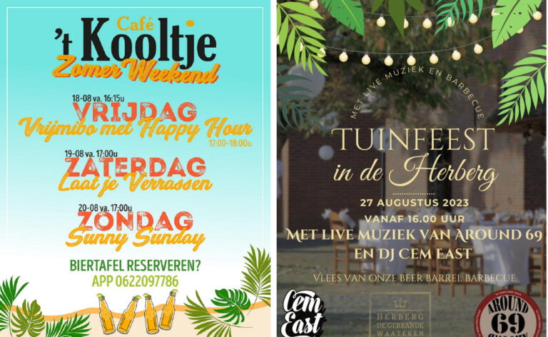 De bouwvakantie loopt helaas voor velen alweer op zijn einde. Ruim een weekje nog en menigeen moet weer aan de bak. Dat betekent nog even rustig aan doen of juist nog één keer uit je dak gaan. Zowel Café ’t Kooltje als Café De Gebrande Waateren hebben een bomvol programma gepresenteerd om iedereen nog even flink te laten genieten. Hieronder de programma’s: