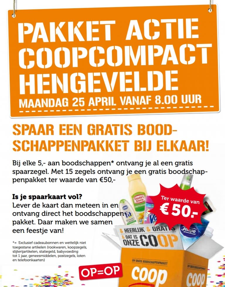 Bij elke 5,- aan boodschappen* ontvang je al een gratis spaarzegel. Met 15 zegels ontvang je een gratis boodschappenpakket ter waarde van €50,- Is je spaarkaart vol? Lever de kaart dan meteen in en ontvang direct het boodschappenpakket. Daar maken we samen een feestje van!