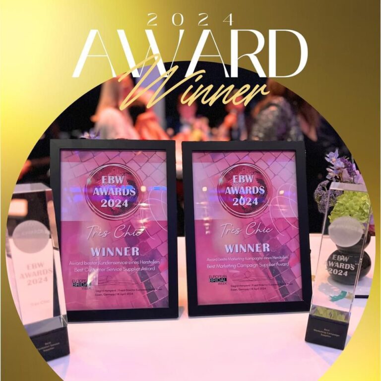 Très Chic heeft twee hele mooie prijzen gewonnen op de European Bridal Week in Essen. Met Marketing eerste prijs en met Service eerste prijs! En dat in het 60 jarige jubileumjaar 60 jaar.