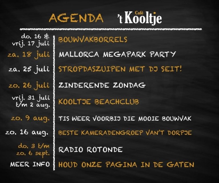 Het krijtbord is ingevuld, de agenda is rond en die pleertent blijft nog een tijdje langer staan!De komende maanden staan nog een aantal feestjes bij 't Kooltje in de agenda en daar willen zij jullie graag voor uitnodigen! De aftrap is op: