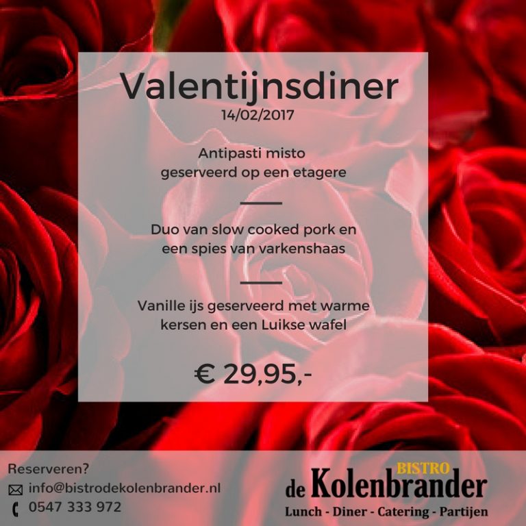 Verras jouw Valentijn en beleef een romantische en culinaire avond bij Bistro de Kolenbrander. Geniet op 14 februari van een speciaal voor Valentijn samengesteld 3-gangen menu voor €29,95.