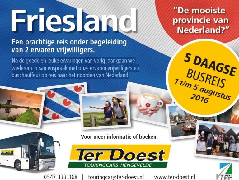 Na het succes van afgelopen jaar start op 1 augustus, onder begeleiding van twee ervaren vrijwilligers, de vijfdaagse busreis van ter Doest naar Friesland. Vijf dagen in het drie sterren hotel Gaasterland dat aan de rand van het eeuwenoude Rijsterbos ligt, vlak bij de Friese IJsselmeer kust. De kosten voor deze trip zijn € 425,- . “Een prachtige locatie voor een ontspannen vakantie”, aldus Raymond ter Doest. “Karakteristieke dorpen, mooie meren en uitgestrekte bossen in de nabije omgeving, zelf vind ik het een unieke reis en ook nog eens compleet verzorgd”. Hieronder alle benodigde informatie: