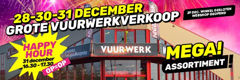 Op 31 december vindt er een speciale Happy Hour plaats van 16.30 tot 17.30 uur. Tijdens dit uur worden hoge kortingen aangeboden op het gehele assortiment. Daarnaast is er gratis parkeergelegenheid en zijn er geen wachttijden, zodat je snel en gemakkelijk je vuurwerk kunt ophalen.