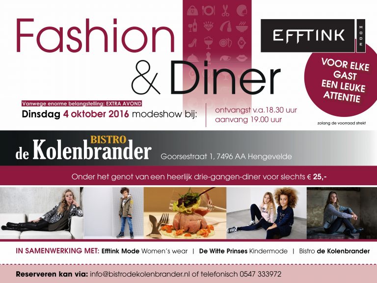 Leuk nieuws: de eerste fashion & diner was al binnen 5 dagen volgeboekt. Efftink Mode, de Witte Prinses en Bistro de Kolenbrander hebben daarom besloten om een extra avond te organiseren op dinsdag 4 oktober. Voor meer info zie FB of onze website. Modellen van Efftink Mode en kinderen van De Witte Prinses presenteren u de prachtige najaar- en wintercollectie 2016/2017. Laat u inspireren door de laatste fashiontrends! Tijdens de modeshow serveren wij een culinair driegangendiner uit voor slechts €25,-. Kom en geniet met vrienden, buren, familie of teamgenoten van deze gezellige avond. Graag tot dan! Reserveer snel en voorkom teleurstelling. Bel naar 0547-333972 of stuur e-mail naar [email protected]