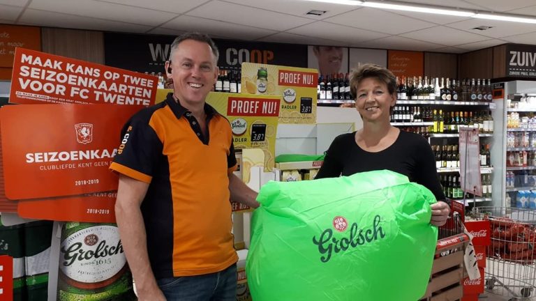 Twee blije winnaars naar aanleiding van de Grolsch Radler actie bij Coop Hengevelde. "Wij wensen familie Lentelink en Lidy te Welscher veel zitplezier met de Grolsch Seatzac!", aldus Stefan Hemel van Coop Hengevelde.