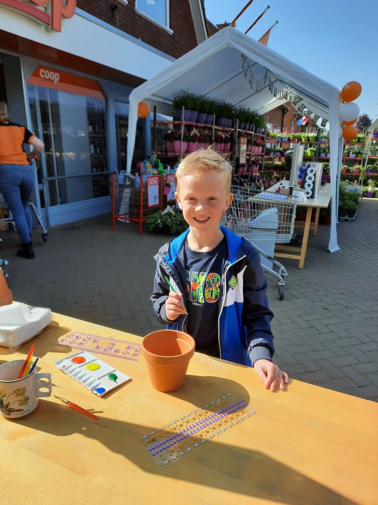 De Coop was vrijdag nog maar net open en de eerste bezoekers kochten al bloemenhangers voor moederdag. Een gezellige sfeer, muziek even bijpraten met anderen onder het genot van koffie. Terwijl ouders boodschappen deden, was er voor de kinderen de mogelijkheid om een bloempotje te versieren. Deze werd met het plantje als cadeautje voor moederdag ingepakt. Al met al een zeer geslaagde plantjesmarkt en zeker wat ons betreft voor volgend jaar opnieuw te organiseren!