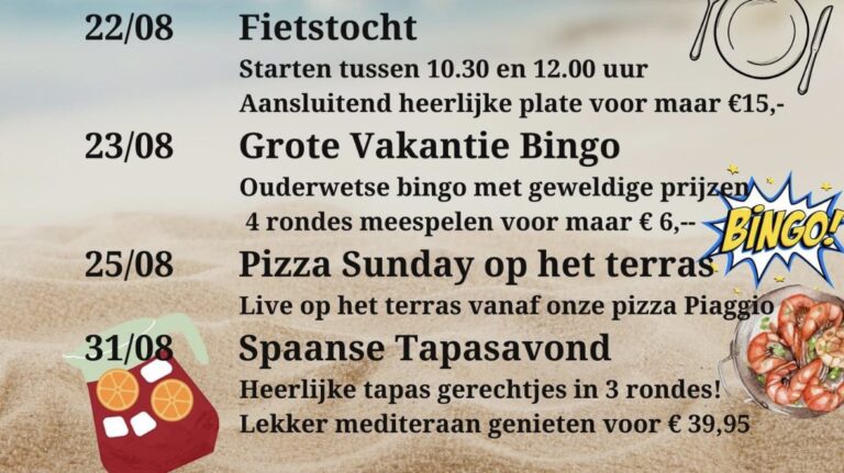 Onze grote vakantie bingo is terug! We draaien weer 4 rondes bingo en hebben uiteraard weer geweldige prijzen!! Ben jij er weer bij?? Reserveer snel je tafel en speel mee voor die geweldige prijzen!