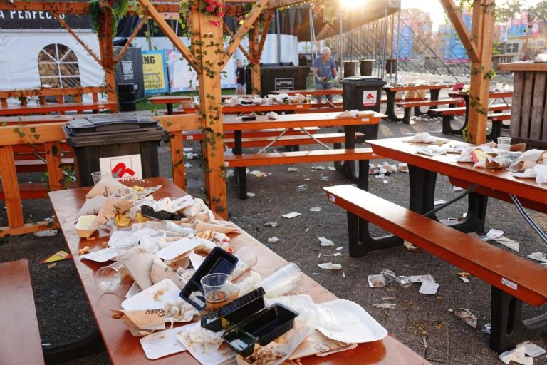 Voor dag en dauw wordt de Zomerfeestweide weer omgetoverd van een bende naar een strak georganiseerde en opgeruimd feest terrein. Dienbladen worden opgestapeld, tafels schoongeveegd, en het rondslingerende plastic verdwijnt in de container.